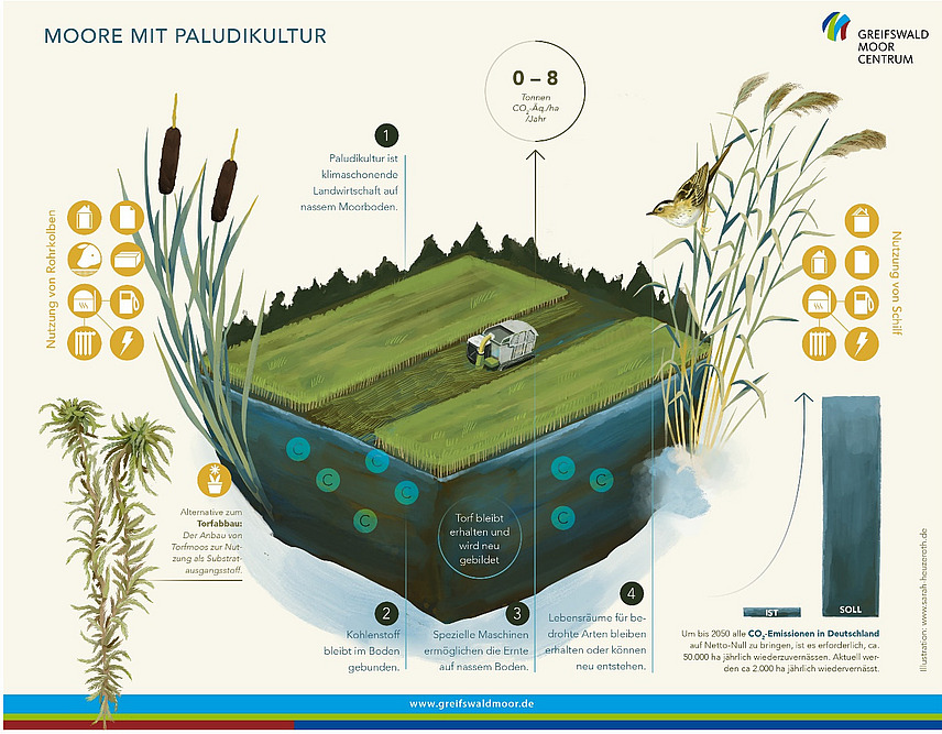 Alle drei Pflanzen wachsen auf einem nassen Untergrund, welcher in dem Querschnitt blau, braun bis ins Schwarze gehend dargestellt ist. Kohlenstoff als großes C dargestellt, befindet sich im Boden. Als Information steht im Boden außerdem der Satz „Torf bleibt im Boden erhalten und kann außerdem neu gebildet werden“. Unterhalb des Querschnittes befinden sich drei weitere Informationen. Die erste gibt Hinweise auf den Boden und gibt an, dass Kohlenstoff im Boden gebunden bleibt. Die zweite Information bezieht sich auf die spezielle Maschine an der Oberfläche, welche die Ernte auf nassem Boden ermöglicht. Die dritte Information bezieht sich auf die Lebensräume für bedrohte Arten, welche durch Paludikultur auf nassen Mooren erhalten oder neu entstehen können.