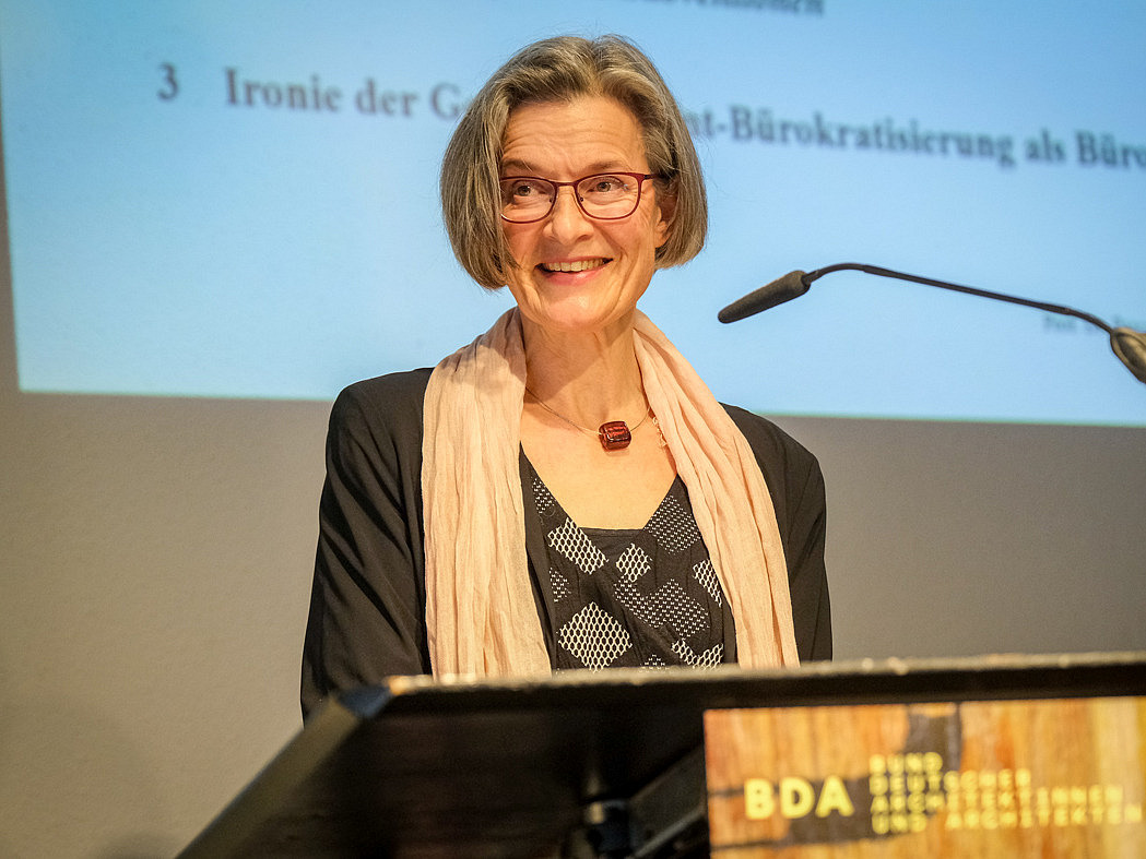 Einen besonderen Akzent setzte Prof. Dr. Pascale Cancik mit ihrem Beitrag zur aktuellen Debatte um den viel geforderten Bürokratieabbau. Obwohl sie selbst nicht aus dem Baurecht kommt, eröffnete sie ihre Ausführungen vor mehr als 150 ArchitektInnen und StadtplanerInnen mit einer pointierten Beobachtung: Der sogenannte „Bauturbo“ sei ein typisches Beispiel dafür, wie Entbürokratisierung paradoxerweise neue Bürokratie erzeuge. Beschleunigungs- und Vereinfachungsmaßnahmen führten häufig zu einer Vielzahl von Sonderregelungen. In ihrem historischen Rückblick zur Entwicklung des vagen Begriffs „Bürokratie“ erinnerte sie mit Verweis auf Max Weber daran, dass Bürokratie ursprünglich für Verlässlichkeit stand – für Regeln statt Willkür, für Besoldung statt Korruption. Bürokratie könne somit auch Schutz vor staatlicher Willkür bieten.
