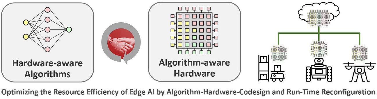 Edge AI verlagert Machine Learning von der Cloud näher zu Endgeräten oder sogar direkt in die Sensor-Aktor-Systeme, um Echtzeitentscheidungen zu ermöglichen und den wichtigen Anforderungen an Privatsphäre und Sicherheit gerecht werden zu können. Dies ist essenziell für Anwendungen in den Bereichen autonomes Fahren, Industrie 4.0 oder Smart Home. Hardware-Software-Plattformen für das Edge Computing unterliegen starken Ressourcenbeschränkungen und Anwendungen müssen in der Regel Kompromisse eingehen in Bezug auf die Genauigkeit der Berechnungen. Wir setzen daher auf skalierbare heterogene Architekturen, die Domänen-spezifische Architekturen mit GPUs und FPGAs kombinieren. Falls es sich als vorteilhaft herausstellt, können unsere Systeme sogar im laufenden Betrieb ihre Hardwarearchitektur verändern. So können sie sich an neue Anforderungen anpassen und beispielsweise Verlustleistung, Leistungsfähigkeit oder Qualität der Ergebnisse optimieren.
