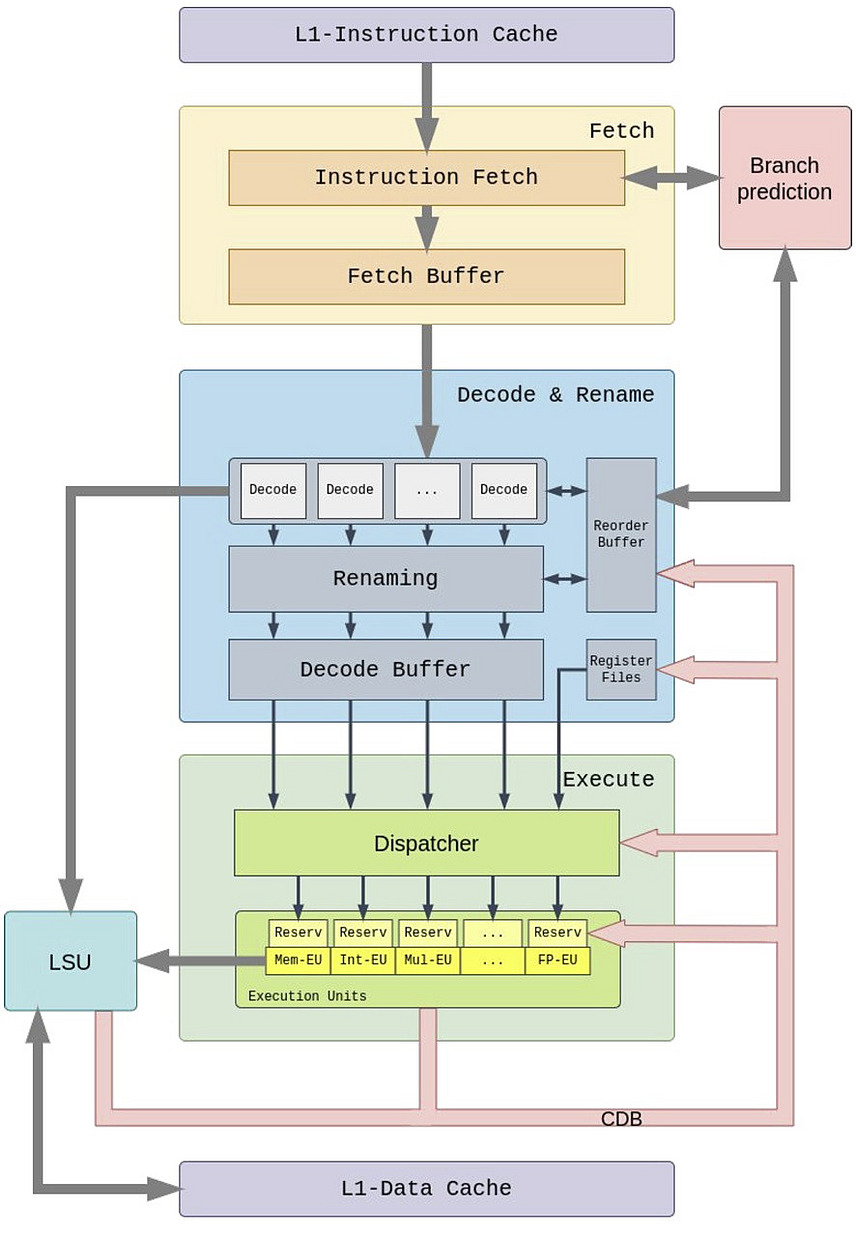 Die grundsätzliche Struktur des Kerns folgt den üblichen Architekturansätzen für superskalare Prozessoren. Die interne Befehlsverarbeitung beginnt mit einer Fetch-Stufe, die eine bestimmte Anzahl von Befehlen pro Taktzyklus aus dem Befehls-Cache abrufen kann. Die Adresse des nächsten Instruktionspakets, das geholt werden soll, wird von der Sprungvorhersageeinheit ermittelt, die eine spekulative Ausführung ermöglicht. Die Instruktionen werden anschließend dekodiert, und für jede Anweisung wird ein Eintrag im Reorder-Buffer reserviert. Die nachfolgenden Registerumbenennung löst die Abhängigkeiten zwischen den Anweisungen auf und ermöglicht die Verarbeitung der Befehle außerhalb der Programmreihenfolge. Anschließend werden die Befehle an die Reservierungsstationen der Ausführungseinheiten weitergeleitet; dort warten die Befehle auf die für die Ausführung erforderlichen Daten, die über den Common Data Bus bereitgestellt werden. Die Adressen für Lade- und Speicheroperationen werden in der Memory-Execution-Einheit berechnet und dann an die Load-Store-Einheit als Schnittstelle zum Daten-Cache übergeben.